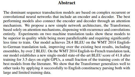 The dominant sequence transduction models are based on complex recurrent or convolutional neural networks that include an encoder and a decoder.