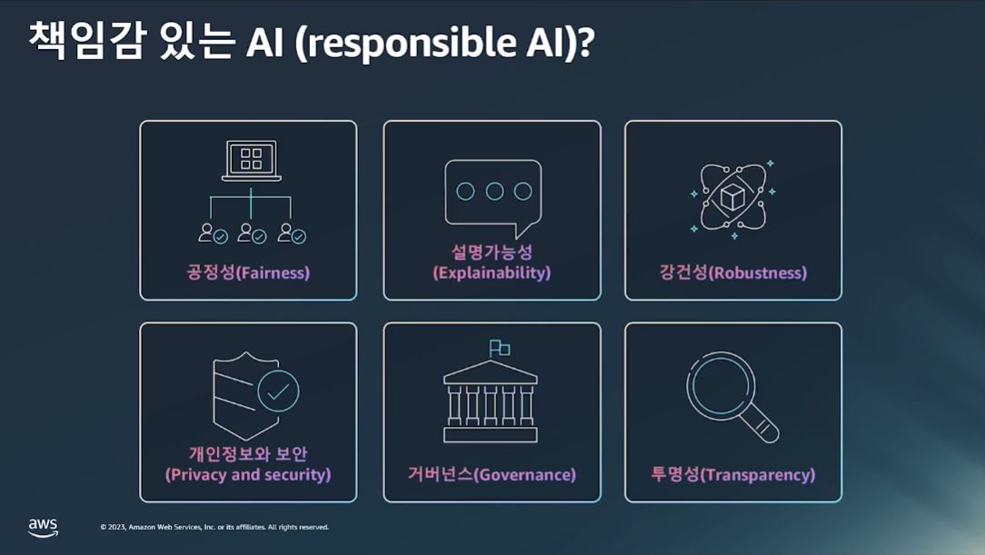 aws에서는 다음 6가지 관점에서 Responsible AI를 설명하고 있습니다.