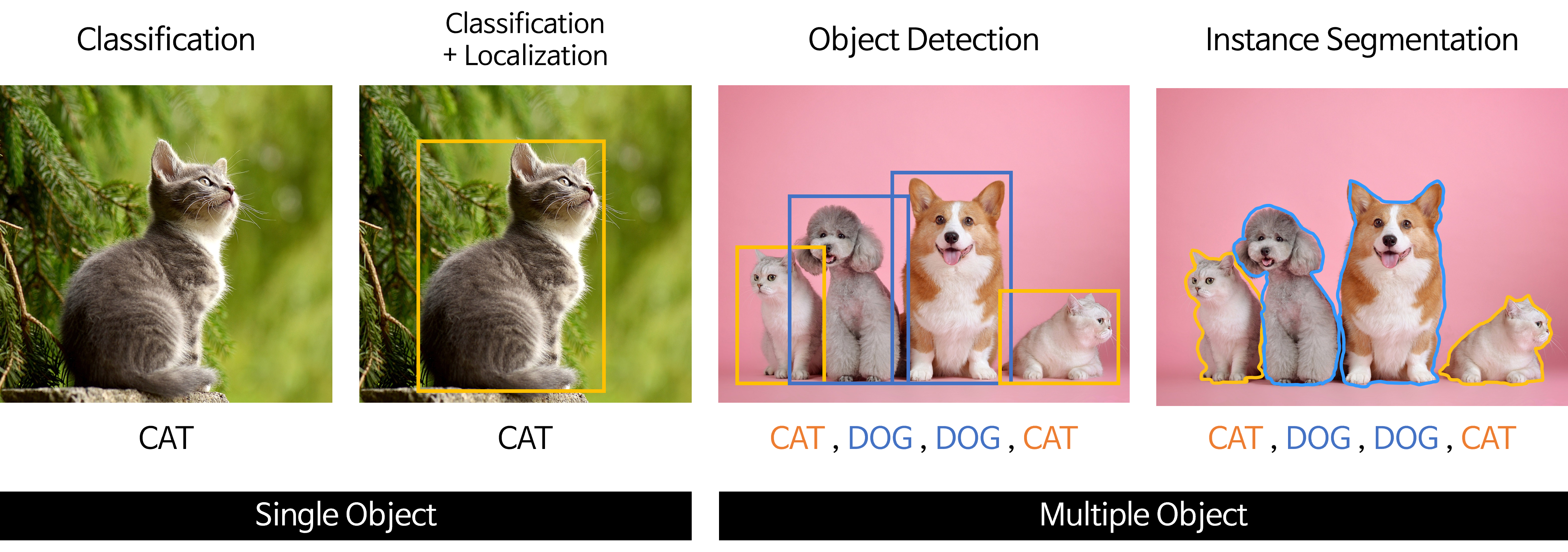 이미지 인식은 이미지나 비디오에서 물체, 사람, 장소, 행동을 식별하기 위해 컴퓨터에 의해 사용되는 기술입니다. 디지털 이미지를 분석하고 그 안에 무엇이 있는지 결정할 수 있는 알고리즘과 컴퓨터 프로그램의 개발을 포함합니다. 레이블이 지정된 대규모 이미지 데이터셋에 대해 훈련되어 서로 다른 객체와 장면이 어떻게 생겼는지 학습한 다음, 이 지식을 사용하여 새로운 이미지에서 유사한 개체를 인식하게 됩니다. 주요 문제로는 Classification, Object Detection, Instance Segmentation, Pose Estimation 등이 있습니다.