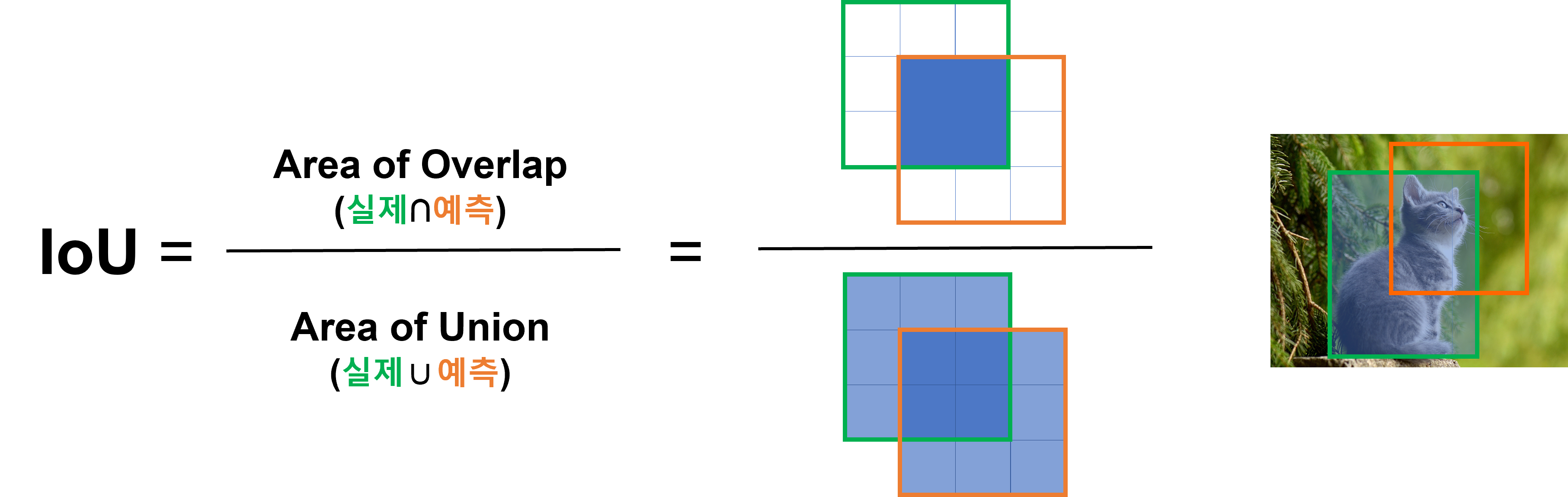 객체탐지의 성능 평가지표로 IoU(Intersection over Union)를 사용할 수 있습니다. Detection 정확도 를 측정하며 경계 상자를 출력으로 제공하는 모든 알고리즘은 IoU 를 사용해 평가할 수 있습니다. 실제 바운딩 박스와 예측 바운딩 박스의 합집합 영역에서 서로 교집합으로 겹친 영역의 비율을 측정하게 됩니다.